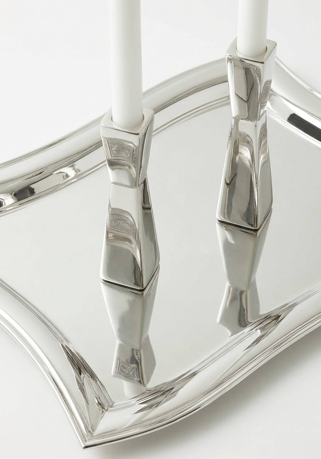 Our trays are designed for candlesticks, challahs or any other luxurious use, and bring with them all the splendor of real silver – without paying the high price of a solid silver tray.